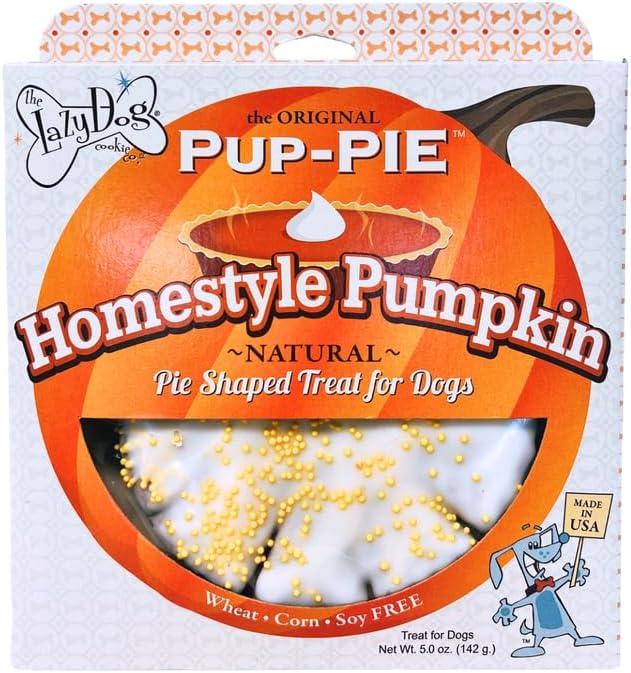 For the pup who loves the idea of pumpkin pie (minus all the sugar and crust), The Lazy Dog Cookie Co.’s Homestyle Pumpkin Pup-Pie delivers: a pumpkin-flavored dog cookie, dusted in a festive way, without the risky pie fillings, sugars, or spices often found in human desserts. It’s a fun, seasonal treat that gives your dog a “holiday dessert” theme safely.