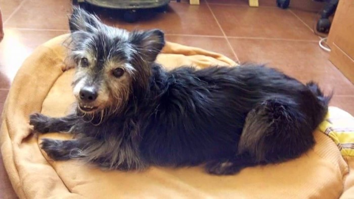 Last Thursday a local rescue group, Defense of Animals (Defaniva) near Valladolid, Spain received a frantic call from a neighborhood group. The group had already called the police because they had heard screams coming from an underground waste container, the rescue’s Facebook page accounts. The group believed someone had cast an unwanted litter of dogs into the locked disposal bin. When the police were unable to open it, they fire department was called in to break it open. No one was expecting what they found. One lone senior dog had been stuck in a garbage bag that was double-knotted (so no chance of escape) and then dumped in the locked garbage can. The rescue believe the dog, now named Abu, is 15-years-old.