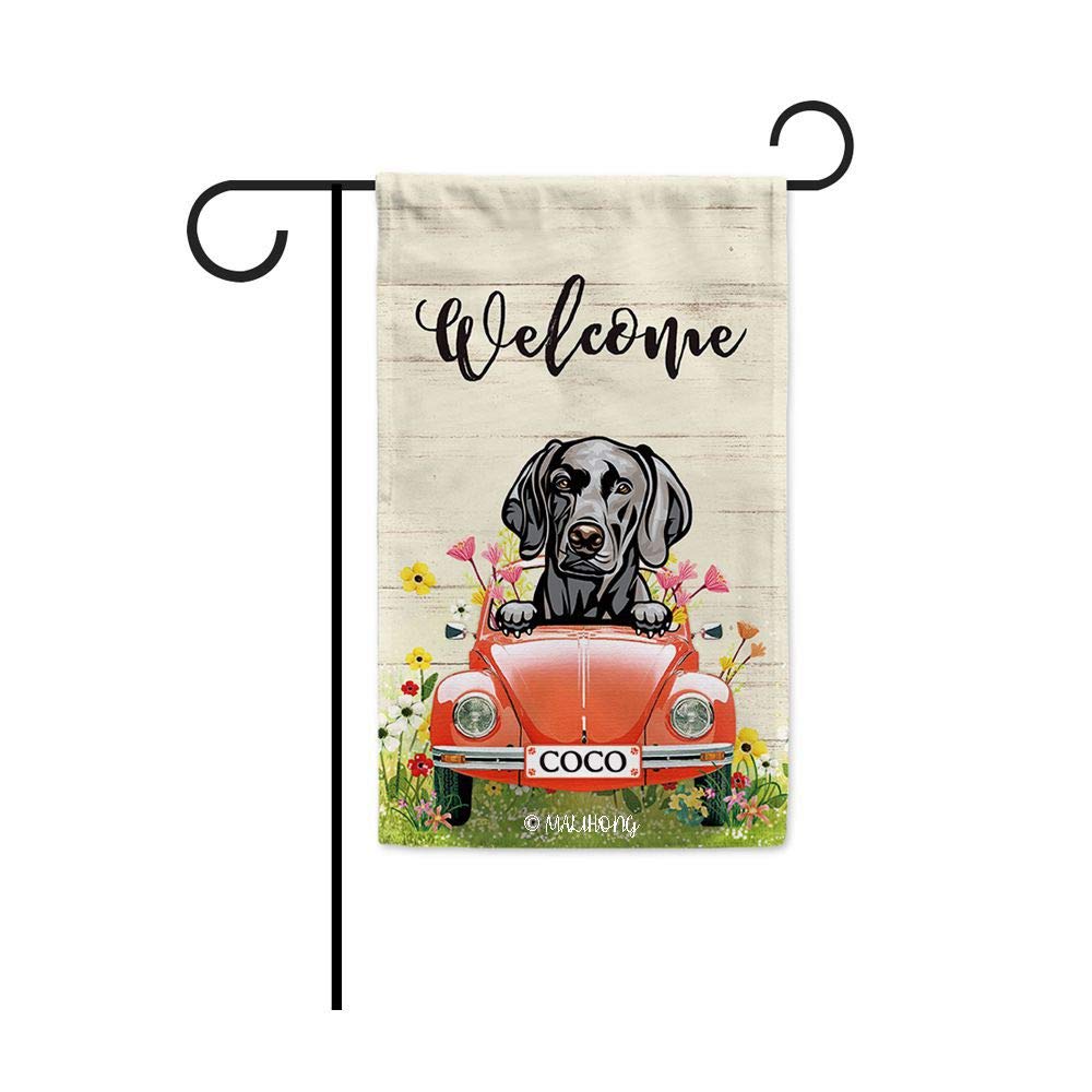 #12 – Welcome Spring Summer Dog Garden Flag Dog Weimaraner in Red Retro Car Flowers Customized name Outdoor Yard Decor Small Flag Double Sided 12.5 x 18 Inch