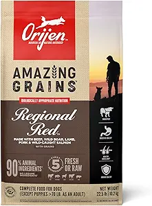 Mine has been on Orijen Large Breed Puppy for his first 18 months and just switched to Orijen Amazing Grains Regional Red. He’s maintained a perfect weight and coat with that food