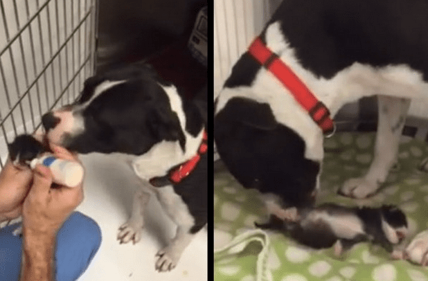 Meet Pitty and Kitty. When this dog and cat duo was found by rescuers on the side of the street in Texas, Kitty was just 2 days old and being nursed by Pitty, a pitbull dog. It was clear the two shared an incredible bond, but Pitty’s milk was drying up, and Kitty’s health needed urgent attention.