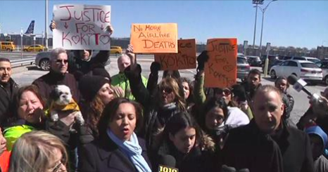 The protesters had a message — “Justice for Kokito” — referring to the French Bulldog puppy that died on a United Airlines flight last week.