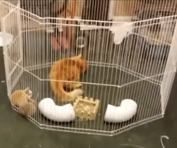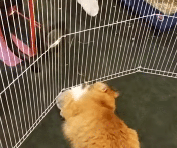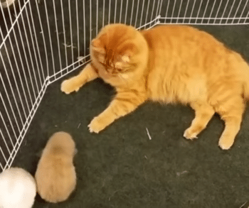In the video, the camera captures someone approaching the pen, where several small brown bunnies are sitting near the front. Mango, however, is huddled further back in the pen, his back turned to the camera. His behavior leaves the viewer wondering what exactly the cat might be doing to the bunnies.