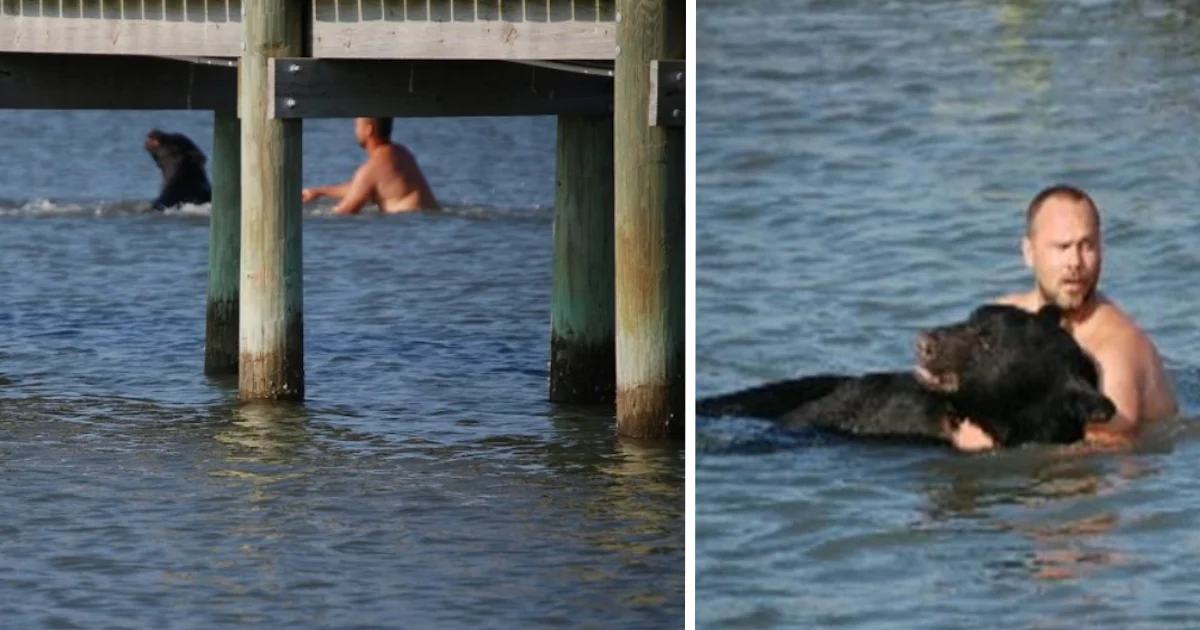 He grabbed the bear by the scruff of the neck keeping its head above water.