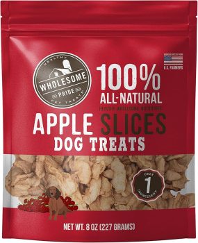 Wholesome Pride Apple Slices are soft, 100% natural dog treats made with dehydrated apples. They are free from artificial ingredients, fillers, and preservatives, making them suitable for dogs with food allergies or sensitive stomachs. These treats can be used for training without compromising your dog’s health, and they are sourced directly from USA farmers, ensuring high quality.
