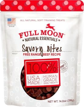 Full Moon All-Natural Human-Grade Dog Treats, Essential Beef Savory Bites, are made with high-quality, all-natural ingredients that meet USDA standards fit for human consumption. The treats are made from free-range beef raised on family farms and are free from glycerin, grains, corn, wheat, and soy. The treats are proudly made in the United States using regionally sourced ingredients, including USDA-approved free-range beef.