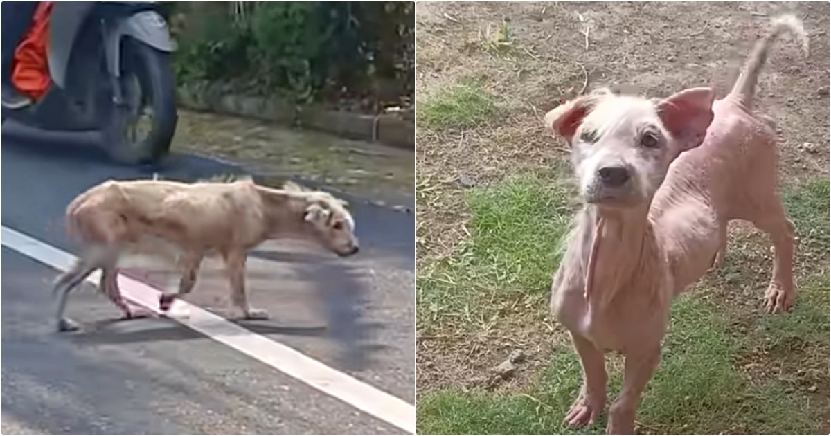 A rescuer named Reto with Furry Luck Bali received a call about a hairless dog roaming the streets. The pup was skin and bones. He was malnourished and fed up with street life. When Reto arrived, he witnessed the dog nearly getting hit by a motorcycle. Reto tried to intervene and rescue the pup, but the dog ran into a field. Reto followed. The dog’s trauma from being a stray wasn’t the only thing Reto needed to work on once the dog was captured. He had to improve the dog’s health so his fur would grow back.