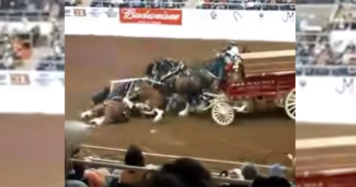 As everyone in attendance gathered with eagerness, the Budweiser Clydesdales made their grand entrance. These majestic creatures embodying beauty, strength, and poise filled the arena with amazement – until a shocking occurrence occurred. One man captured it on camera: all of the horses tumbled down simultaneously! The entire crowd was left in shock as this moment of fright unfolded before them.