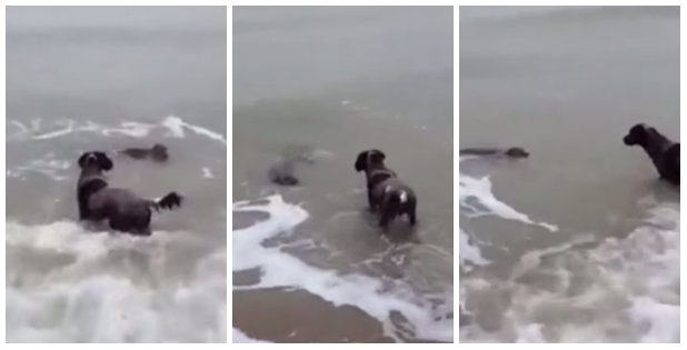 When these two dogs were at the beach with their humans, the friendliest wild seal that ever was caught the attention of one of the dogs, and watching the two exchange polite hellos is just too adorable! You’ve gotta see this!