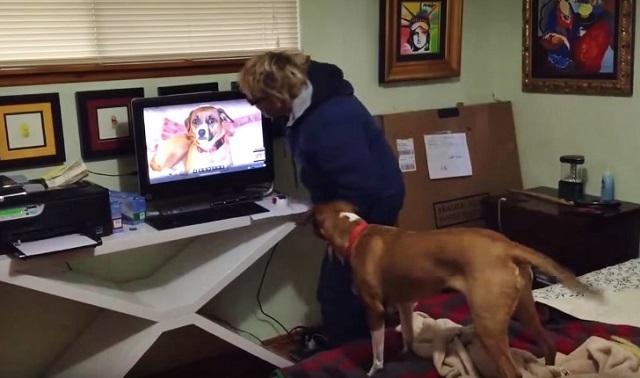 Annie the dog saw her mom kissing a photo of a dog in the computer screen. And since she wants her mom’s kisses all to herself, she’s barking her head off to tell mom to stop kissing the photo! Check out the video below!