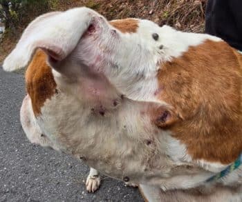 Tony was covered in hundreds of ticks, more than anyone could count at a glance. They clung to every inch of him, especially inside his ears, where the infestation was so severe it darkened the skin. His body showed signs of prolonged neglect. He was severely underweight, his ribs visible, his energy nearly gone. Scattered across his fragile frame were bite wounds and punctures, hinting at a harsh and lonely past.