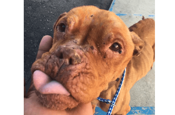 Last week, animal control officers in Hazel Park, Michigan, found her tied to fence next to a burned down building. She was brutally thin, having no means to even find food for herself. She was also heartworm positive. And she has a tumor on her back leg.