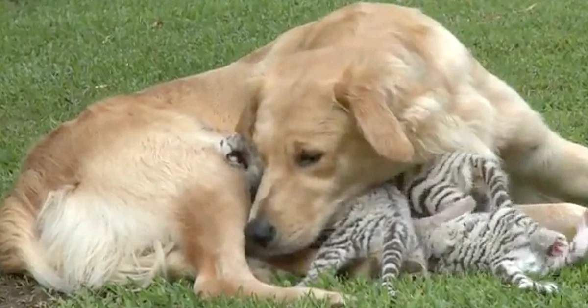 At Safari Zoological Park, a tiger had a litter of cubs but took no interest in them. Without a mother, these babies would need to be bottle-fed for any chance of survival. Thankfully, this Golden Retriever stepped up as a surrogate!