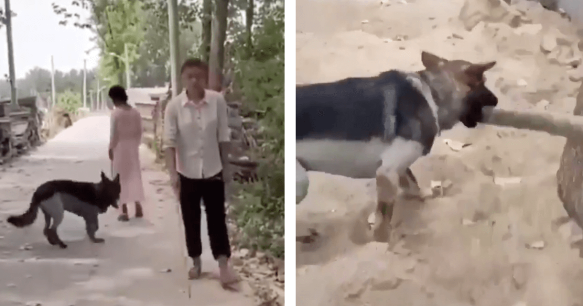After they passed the blind man on their right, the woman seemed to make a gesture to her dog. The pup then turned around, sped in front of the blind man, and removed the heavy stick from his path.