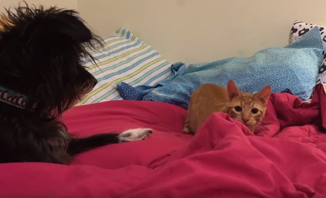 In the video you will see a dog and a cat on the bed. Their human is taking a video of them. A few moments later, the cat launches an attack on the human! Watch the video below and see what the dog does!