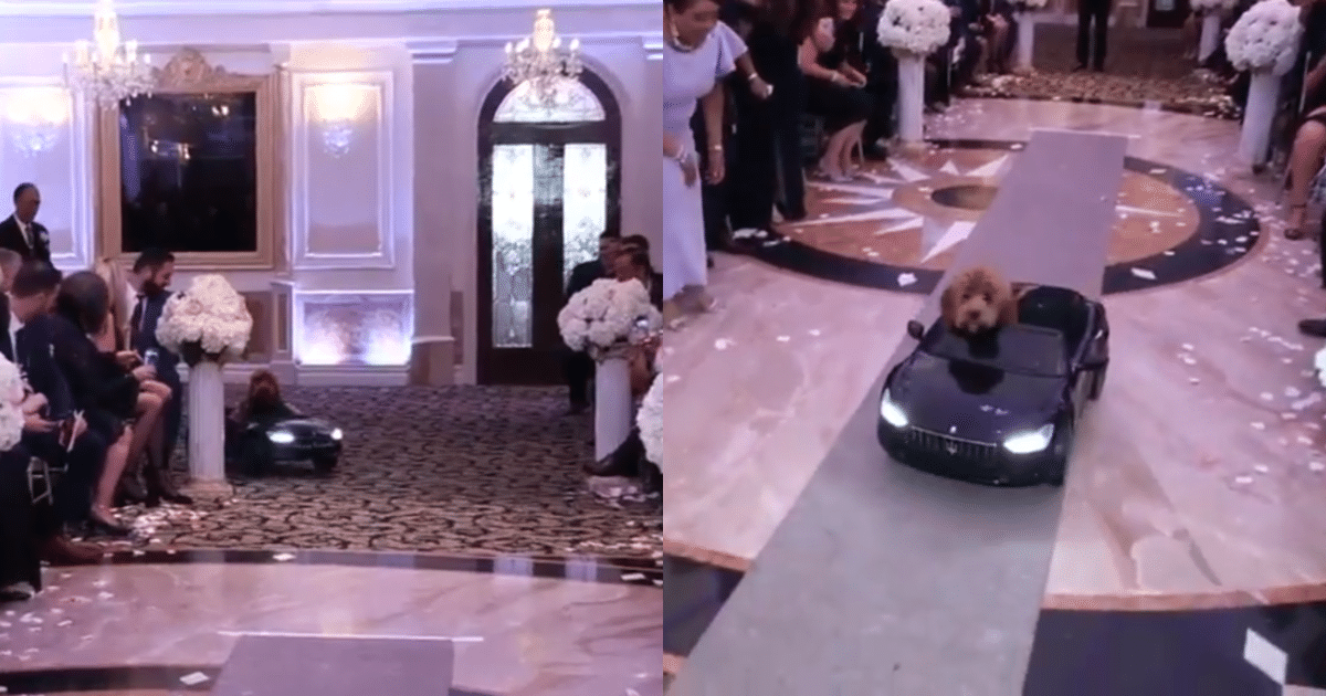 As the ceremony began and all eyes turned toward the aisle, guests were expecting the usual procession of bridesmaids, groomsmen, and possibly a young ring bearer. What they weren’t expecting was to see a dog roll down the aisle in a mini car. As soon as the guests caught sight of the dog, dressed to the nines and looking like a perfect little gentleman behind the wheel, the crowd erupted in laughter and applause.