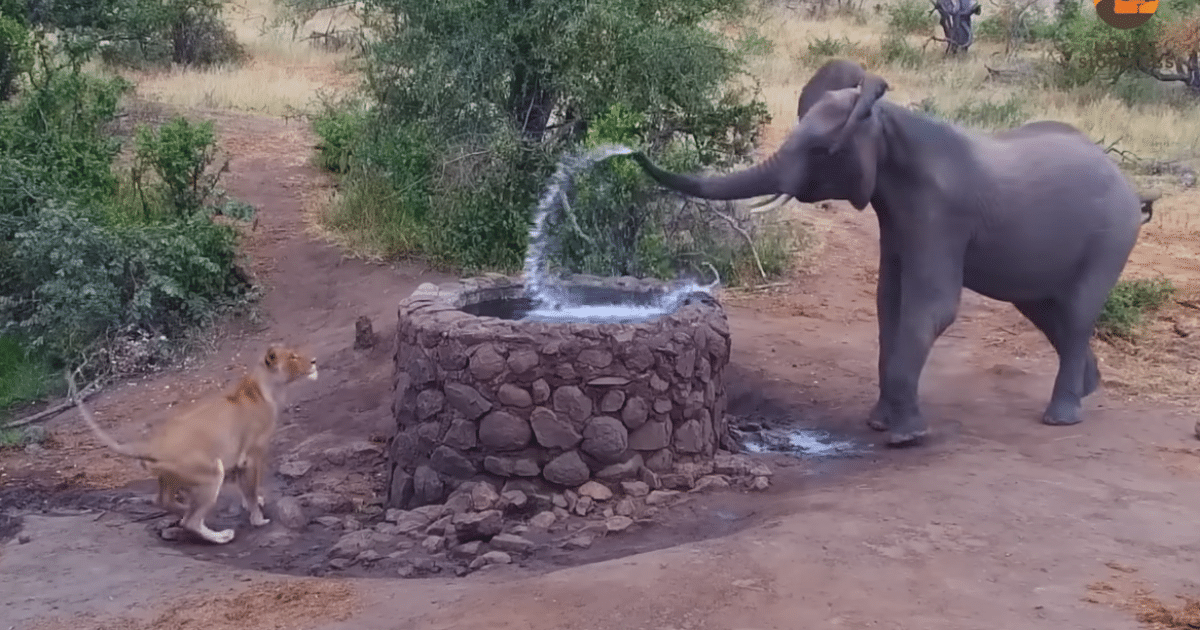Just as the tension reaches its peak, the elephant makes its move — but not in the way anyone might expect. Instead of charging at the lioness or trumpeting a warning, the young elephant lifts its trunk and sprays a generous stream of water directly at the startled lioness!