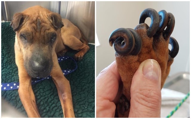 “Her nails had curled around three times before embedding in her pads which were horribly infected – she’d clearly not had them clipped or been walked for a long time.”