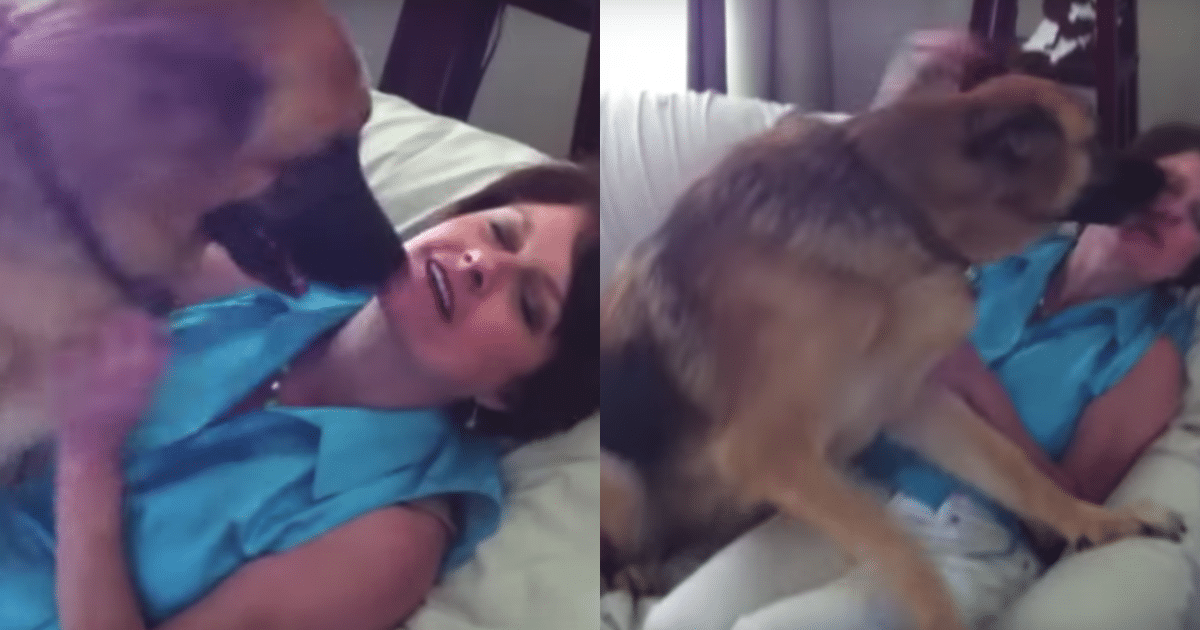 His reaction doesn’t stop there. As the initial shock of her return begins to sink in, Johann becomes even more affectionate. It’s as though he can’t believe she’s really back, and he’s determined to never let her out of his sight again. In typical over-excited dog fashion, he showers her with attention, climbing onto her lap, nuzzling her face, and giving her a seemingly endless barrage of loving licks.