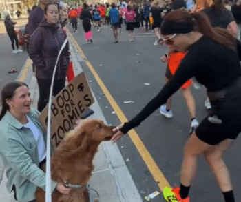 Cait and Becks have made cheering for marathon runners their annual tradition. As dedicated supporters, they show up to energize athletes, bringing smiles, laughter, and a bit of relief to those pushing through the physical demands of the race. Cait, ever the thoughtful pet parent, brings a new theme each year for her and Becks to engage with runners. This year, Cait crafted a simple yet endearing sign for Becks to hold, displaying the words, “Boop for Zoomies.”