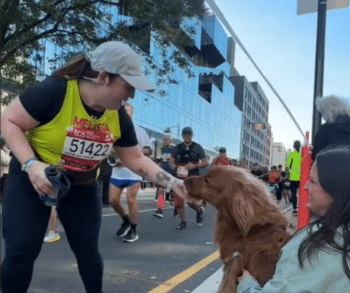 As runners made their way through the course, many couldn’t resist the invitation, stopping briefly to give Becks a “boop” on his nose—a light, playful touch that seemed to inject fresh energy into their stride. With every boop, runners left happier, carrying a bit of Becks’ joyful spirit with them. Even with the long distance ahead, Beck’s cheerful presence was a reminder that moments of fun and connection can make all the difference.