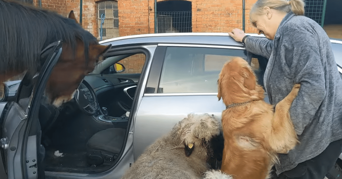 As the animals approached, Grandma couldn’t help but laugh at the sight of the enthusiastic group. The Golden Retriever was the first to reach her, jumping up to plant a joyful kiss on her hand before quickly turning its attention to the open car door. Without hesitation, the playful dog hopped into the front seat, as if declaring the car its new favorite spot. The baby lamb, never one to miss out on the fun, followed the dog’s lead and clambered into the car as well, its tiny bleats echoing in the air.