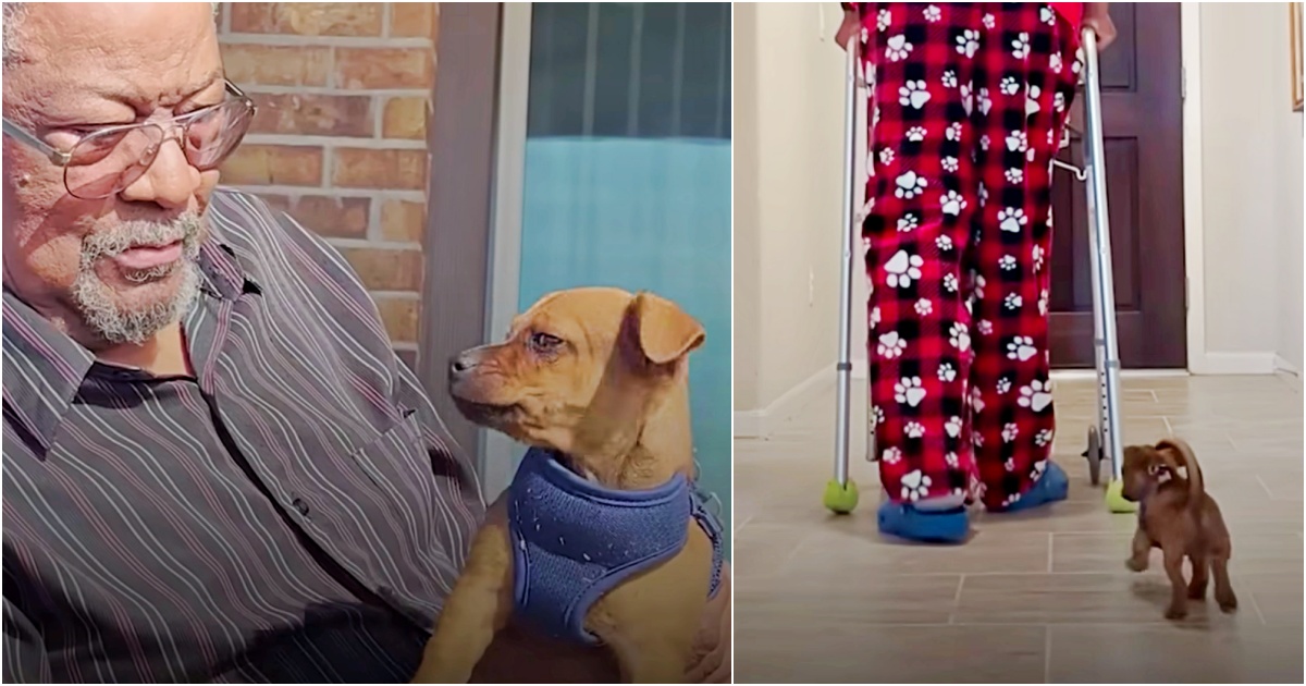 After knee surgery, Papa’s road to recovery isn’t going to be easy, but Roscoe’s unwavering love is exactly what’s needed. Papa has a basket on his walker so he can take Roscoe with him everywhere he goes. The puppy is Papa’s shadow and happily follows close behind him. Their bond is a mood lifter for sure!
