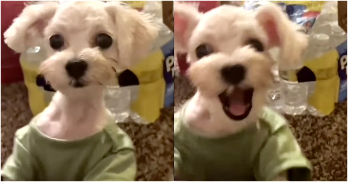 Mom is delighted to see him and greets him by saying, “Hey!” He stares at her lovingly, then does the most adorable thing! Seeing the interaction should come with a warning label: “You may faint from cuteness upon watching.” The puppy tries to greet his mom back in the same way. Yes, he mimics his mother’s facial expressions and even tries to say, “Hey!” to her.