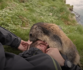 After several minutes of licking and exploring, the marmot seemed content. Instead of wandering off, it did something that left the hiker in awe: the marmot climbed onto his face and rested there, as if it had found a comfortable spot to relax. The hiker lay perfectly still, amazed by the marmot’s incredible trust. He knew that this was a once-in-a-lifetime moment, one that he would never forget.