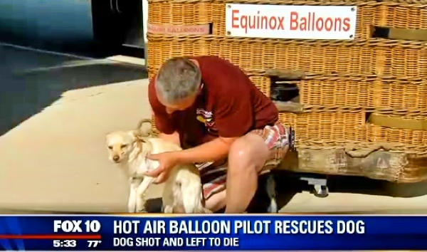 It was Valentines day in Tonopah Arizona, and everyone was having romantic scenic tour riding a hot air balloon. A hot air balloon pilot named Jason Elkins, was about to land the balloon with his passengers in it, when a dog came running to them for help. The poor was starving and he was injured. Elkins fed the poor dog and searched for his owner. When he couldn’t find the dog’s owner, he decided to bring the dog home and named him Chase. Chase had a wound in his belly. Veterinarians believe that the dog may have been shot several times with a high-powered BB gun. Chase is currently on pain medication and he may need surgery. But he’s lucky to be found by such a kind-hearted man. Chase is alive because Elkins was there to help him. Watch the video below for the full story.