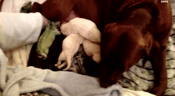 Elaine Cooper was shocked when she saw one of the puppies her Labrador Retriever, Milly, delivered. Milly is a chocolate Labrador and her puppies are all yellow – except for one. While most of us would expect the other pup to be black or chocolate, she was neither. Instead, she was green! “We’d never heard of it before and couldn’t believe our eyes,” Cooper told Insider Edition. “We thought it was a black labrador at first when it was in the sack. Then when she licked the placenta off, the puppy looked emerald green.”