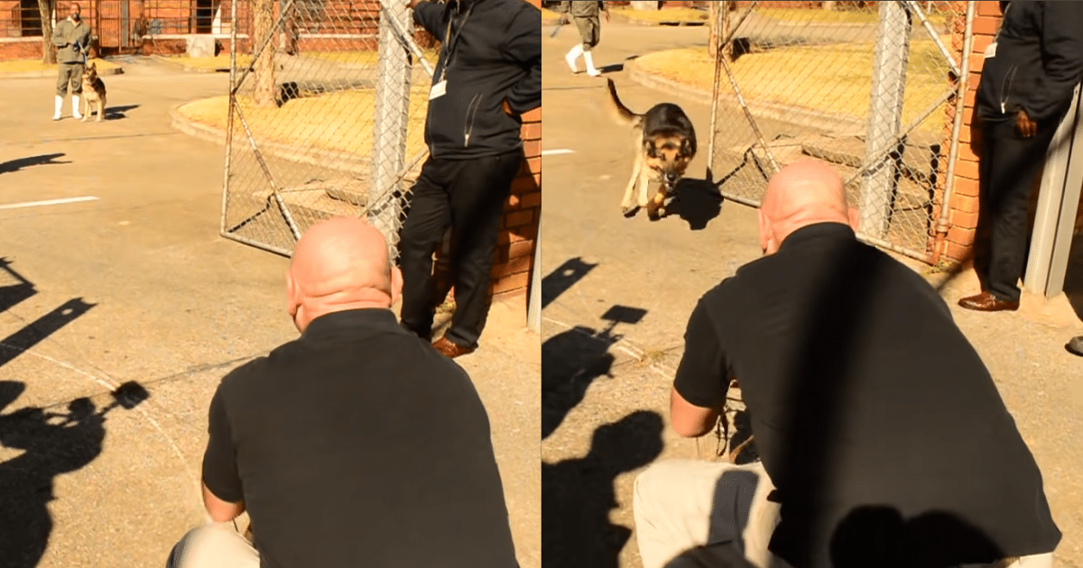 Inside the facility, Django was waiting, separated from Sheldon by a gate. Sheldon positioned himself so that Django could see him clearly. As soon as the guards opened the gate, Django began wagging his tail furiously and pulling on his leash, eager to reach his beloved handler.