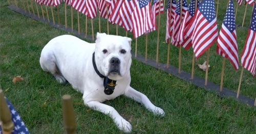 His name is Sheriff Bruno, and he’s an American Bulldog mix. He was adopted from a shelter where he was found malnourished and in bad shape. Once he recovered, his personality was able to fully bloom and his gift for connecting with others was fully realized.