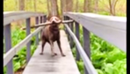 Now this dog found a big stick during their walk. And he sure wants to bring it home with him. But there’s just one problem, he’s carrying the stick with his mouth, and it’s too wide to fit through the narrow wooden bridge. He got through the first half of the bridge, and he’s stuck in the middle. Check out the video below and see how this dog gets through the bridge!