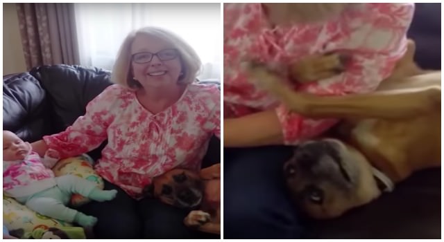 The dog in the video below sees Grandma giving the baby all the attention, and he wants some love, too! The pooch tries to be as cute as possible, even wrapping his paws around her arm! This grandmother can’t help but laugh at his hilarious behavior (can you blame her?!).