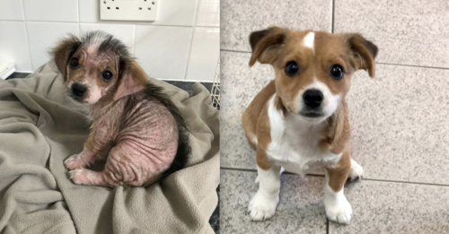 When Terra was first rescued, she had almost no hair and she seemed very fearful. Her hair loss was the result of a skin condition which likely came about because her previous family was neglectful. The poor puppy had a lot of recovering to do, and she didn’t even know what it was like to be loved. Luckily, a kind veterinary worker from West Sussex, UK decided to help Terra through her recovery process.