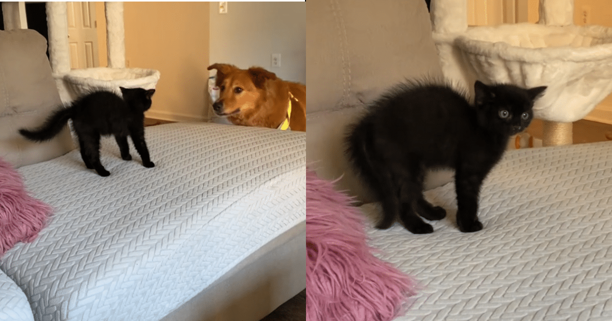 When Egg, an adorable black kitten, was brought home to meet her new family, she immediately came face to face with her future sibling, Sadie, a gentle golden retriever. The excitement of a new friendship wasn’t mutual at first. Egg, overwhelmed by the new environment and a large unfamiliar dog, reacted defensively. As many kittens do when they feel threatened, Egg’s initial response was to hiss, arch her back, and puff out her tiny tail—an unmistakable signal of discomfort and fear.