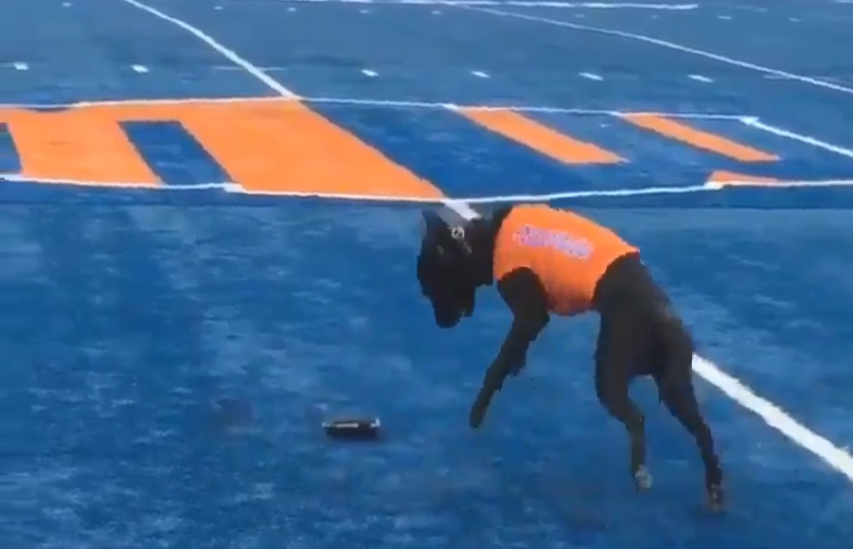 Cowboy Kohl is the most recent dog employed by Boise State’s Broncos to fetch the kickoff tee from the field. He took up the post last year after Zee, the previous tee-dog, retired after 6 years with the Broncos. And it looks like he’s doing a fantastic job!