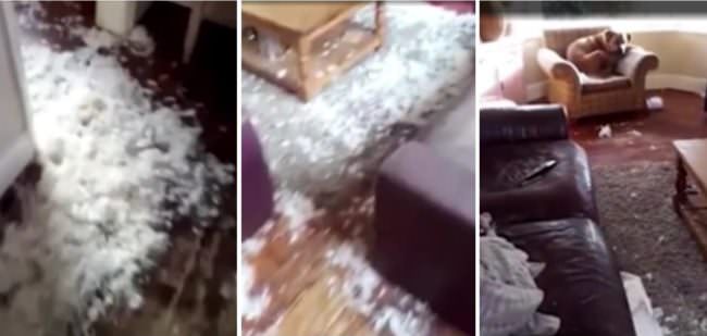 UK bartender, Sophie Robinson returned home from work to find that her feather pillow had been massacred. She instantly suspected her sweet, but mighty dog, Yogi who had failed to greet her at the door.