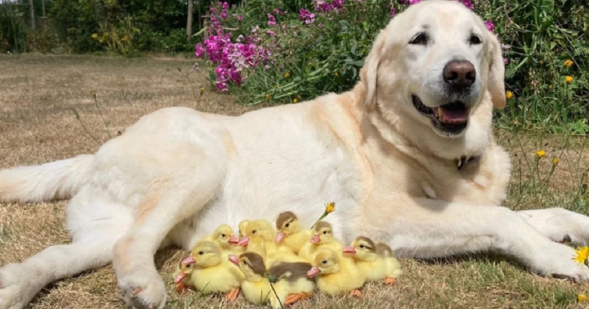 Senior Labrador Steps In As Foster Dad For Fifteen Orphaned Ducklings
