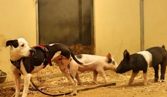 Rescued Piglets Take Three-Legged Pit Bull For A Walk