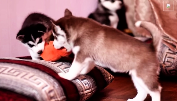 Husky Puppies Fight Over One Toy, Watch What Mama Husky Does To Settle the Fight!