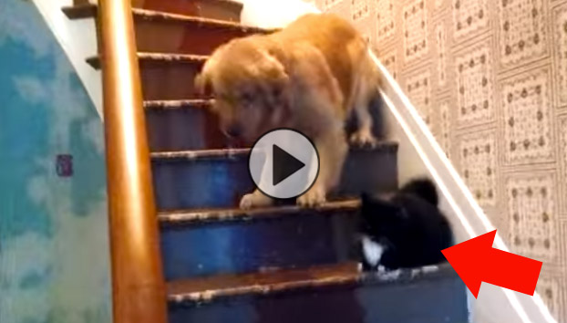 Bo-Sox is an adorable, sweet mannered golden retriever with a big fear: the cat! Chevy the cat sits leisurely on the stairs, and we assume her body language is telling Bo: you shall not pass! The family chips in to try to help Bo conquer his fear. Even the german shepherd puppy gives a demonstration of how it’s done. But ultimately, the son guides Bo down the stairs. Too cute! Don’t you just wanna hug Bo? Tell us in the … Read more