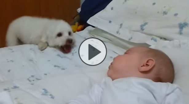 There’s something loud and smelly on top of that bed, and Billy the dog is determined to see it! I’m not sure if he’s really trying to get on the bed, or he’s just playing an adorable game of peekaboo! Either way, I think these 2 cuties are destined to be best friends. How does your dog react to babies?