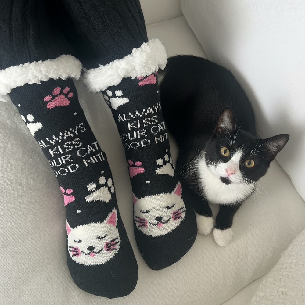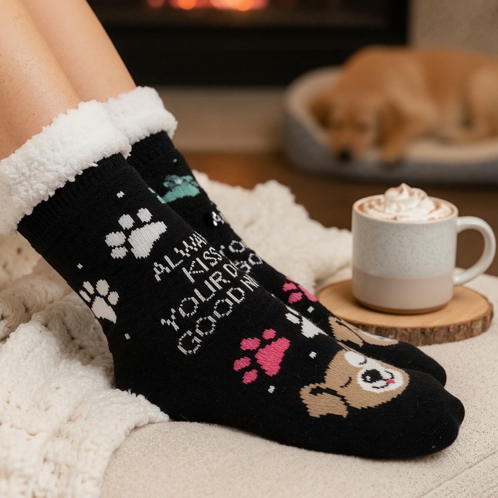 Wrap your feet in comfort and love with these Always Kiss Your Dog Good Nite sherpa lined slipper socks—designed for dog lovers who know that every night ends best with a wag and a kiss. Featuring adorable paw prints, a sleepy pup face, and playful pops of color, these socks bring warmth, whimsy, and paw-sitivity to your nightly routine.