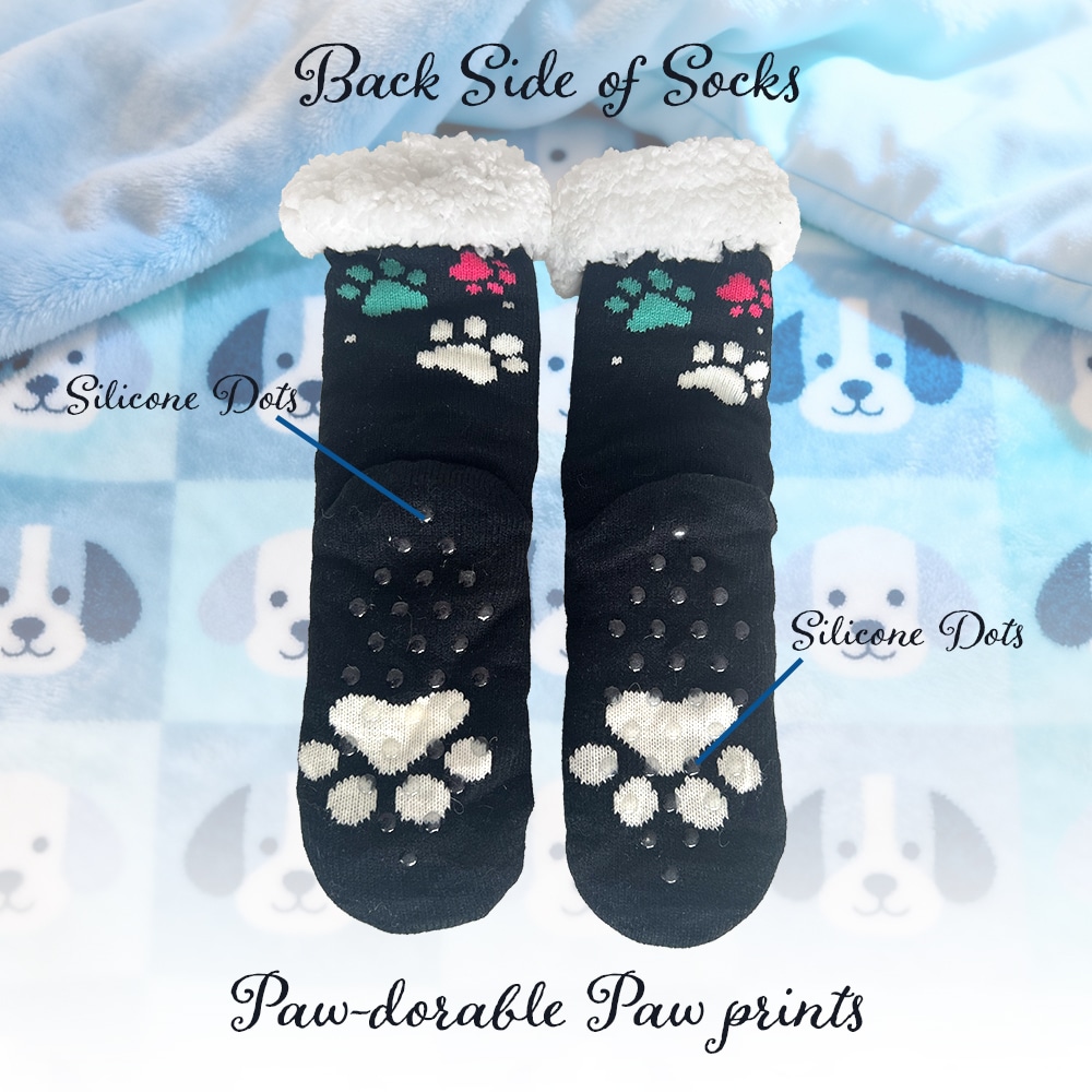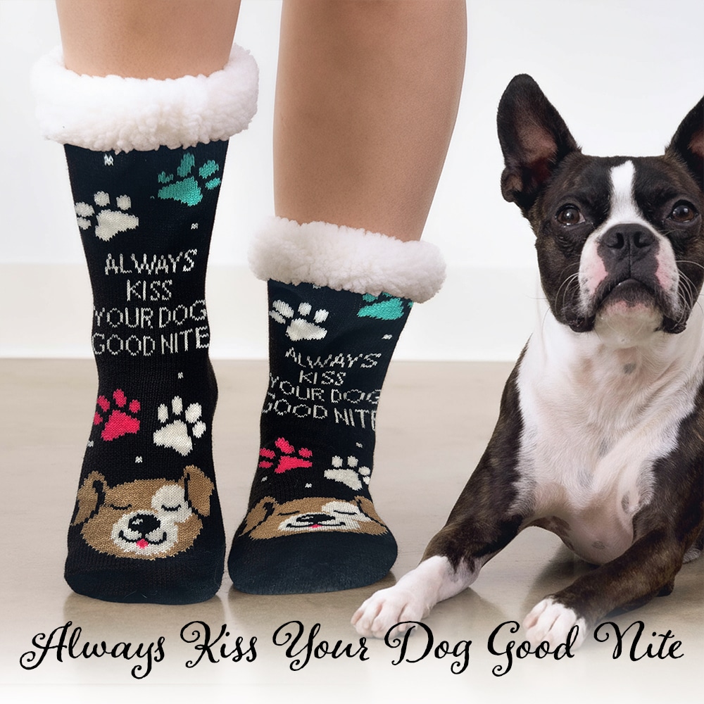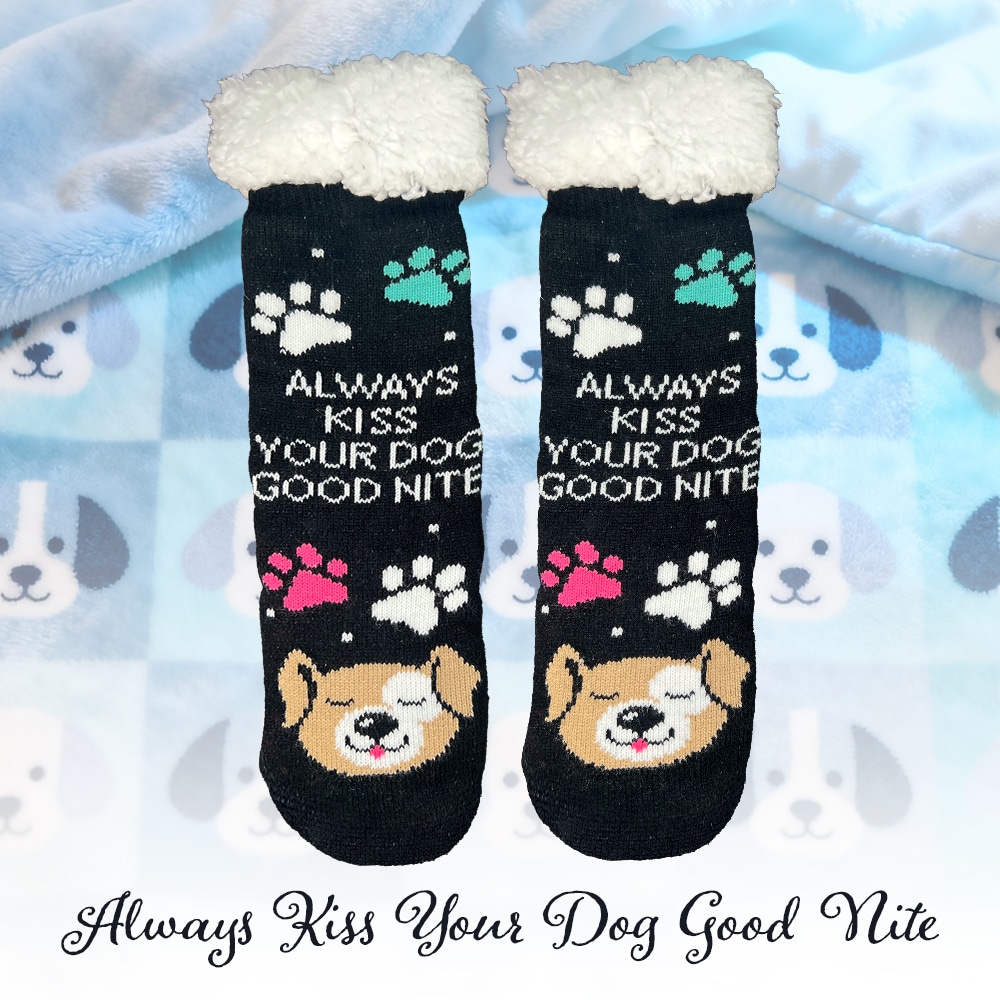 Always Kiss Your Dog Good Nite-Cozy Paw Print Sherpa Lined Slipper Socks- Helps Feed Hungry Dogs in Need