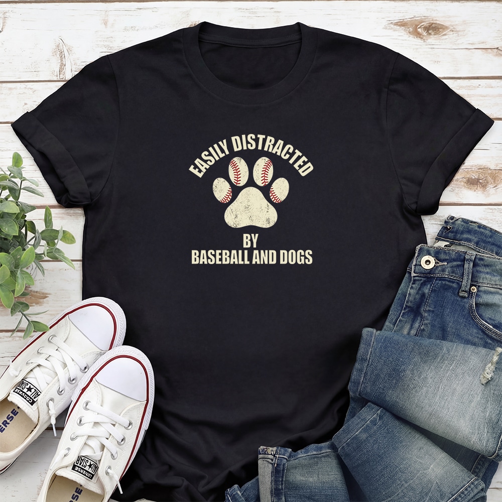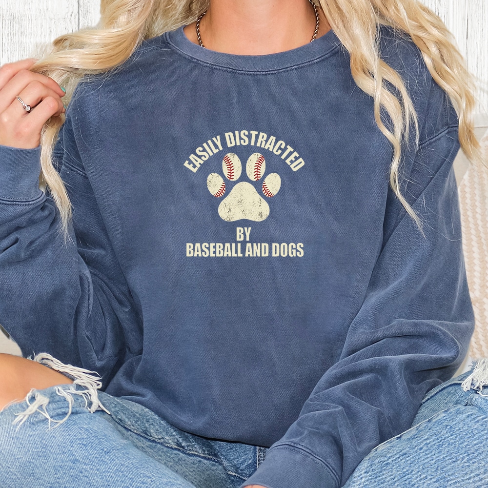Comfort Colors Easily Distracted By Baseball And Dogs Vintage Washed Tee – Blue Jean