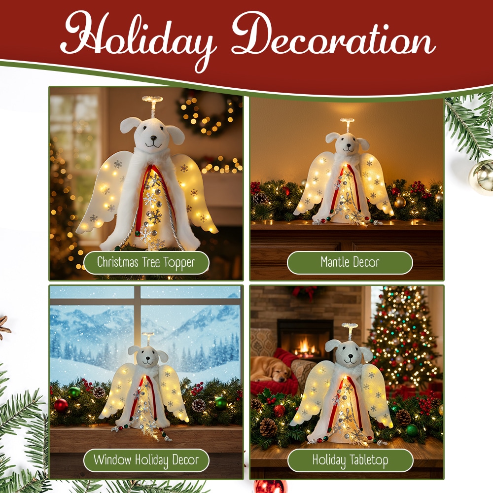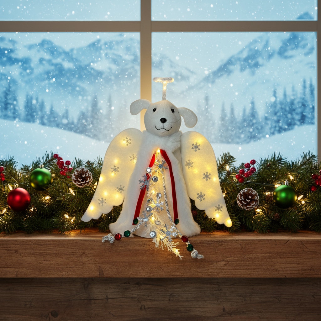 - Divine Design: This white fabric dog angel sparkles like fresh snow, with glowing wings, a lighted halo, and a snowflake garland accented by red ribbon, rhinestones, and silver/white rope. Perfect for the tree, mantle, or entryway to brighten any holiday spot.