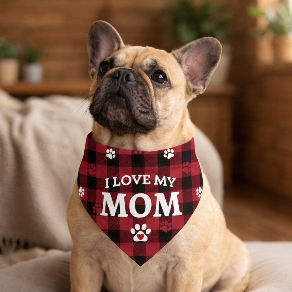 Celebrate the special bond between pups and their favorite human with the I Love My Mom Buffalo Plaid Dog Bandana. Featuring a classic red and black buffalo plaid design with playful paw prints and the sweet message “I Love My Mom,” this bandana is the perfect way for your dog to show a little extra love. It’s a fun and heartwarming accessory that makes any day feel like Mother’s Day.
