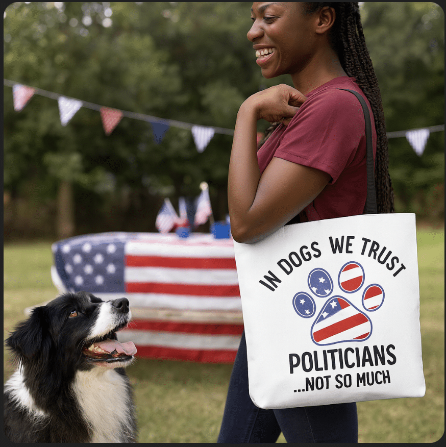 Whether you’re grabbing groceries or heading out with your pup, this tote makes a statement: trust dogs, not politics.